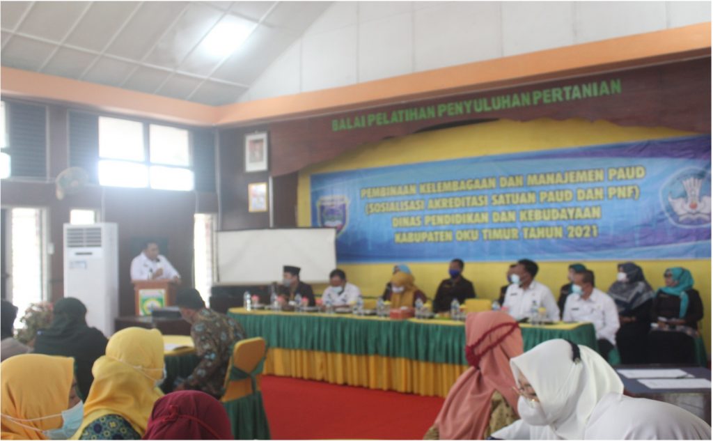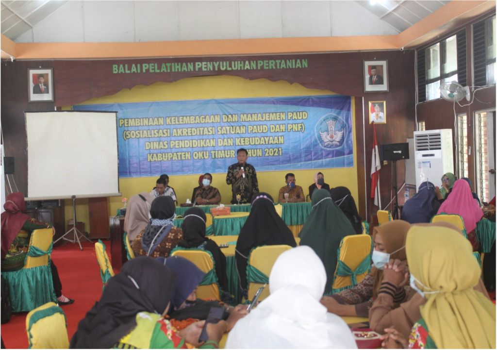 Dinas Pendidikan dan Kebudayaan Kabupaten OKU Timur melalui Bidang Pembinaan PAUD dan PNF menyelenggarakan Program Pembinaan Kelembagaan dan Manajemen PAUD dan PNF melalui kegiatan Sosialisasi Akreditasi Satuan PAUD dan PNF Tahun 2021. Peserta Pembinaan dan Sosialisasi ini berjumlah 50 Peserta yang terdiri dari : 4 TK Negeri, 22 TK swasta, 20 Kelompok Bermain (KB), 1 Raudhathul Athfal (RA), 2 Pusat Kegiatan Belajar Masyarakat (PKBM), 3 Lembaga Kursus dan Pelatihan (LKP) yang ada di Kabupaten OKU Timur.